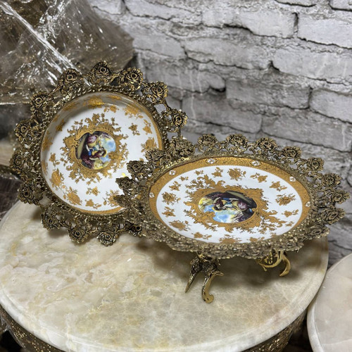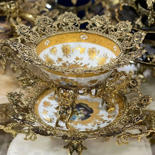 کاسه بشقاب سفید گل رز پایه خرچنگی برنجی
