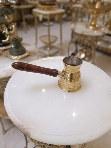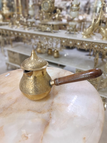 قهوه جوش بدون درب طرح طاووس دسته چوبي 3.5 اينچ برنجی