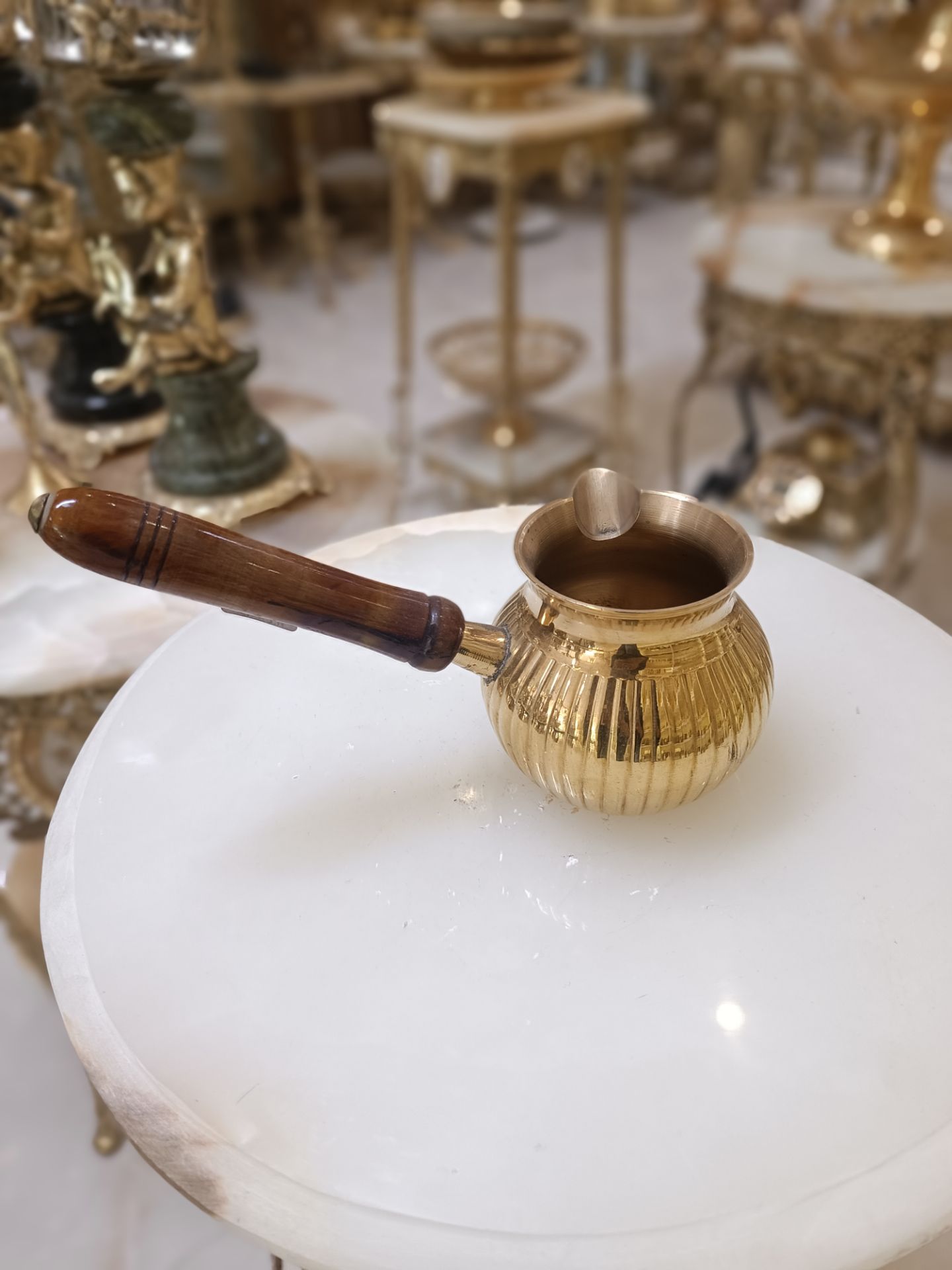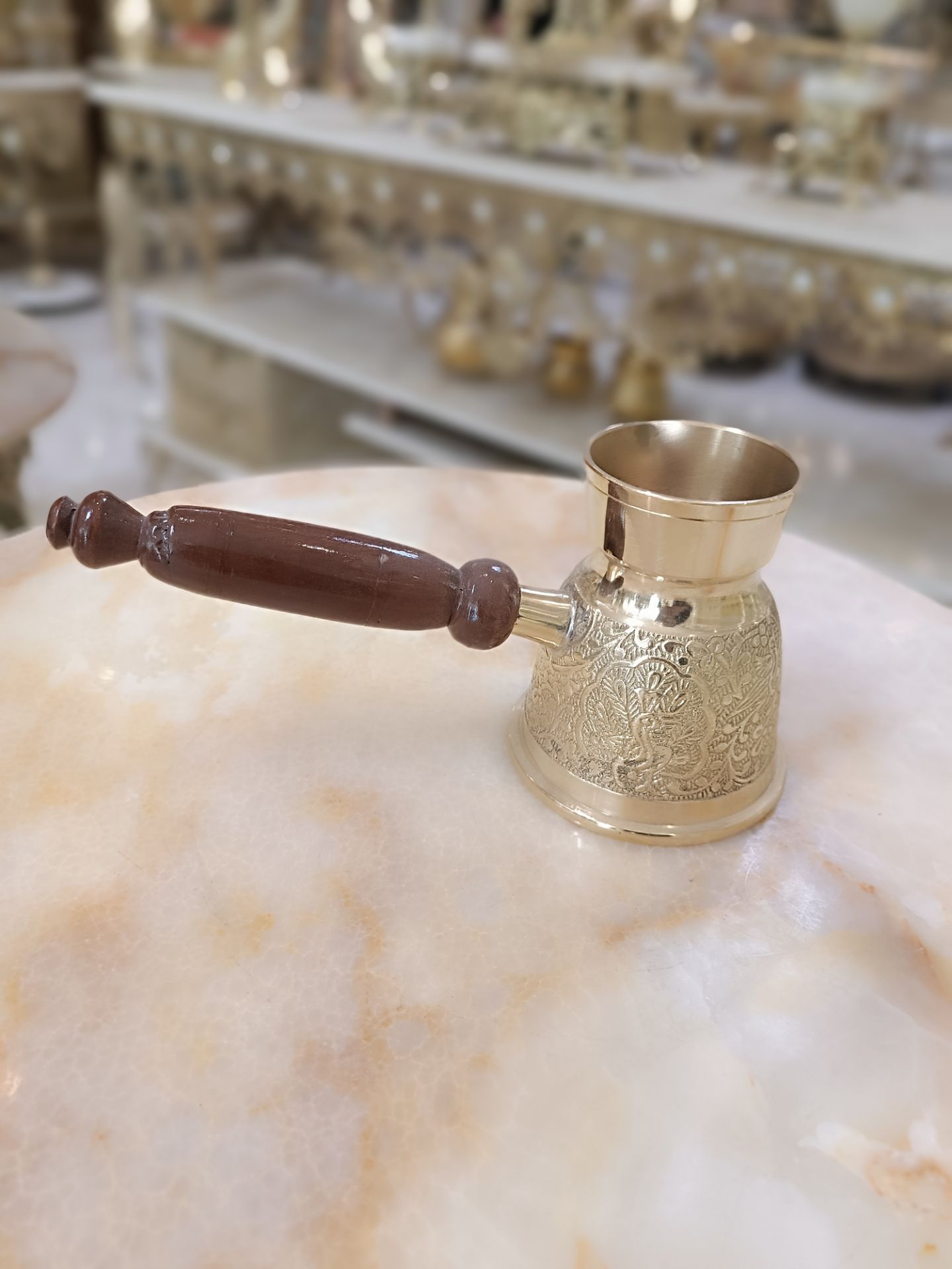 قهوه جوش بدون درب طرح طاووس دسته چوبي 3.5 اينچ برنجی