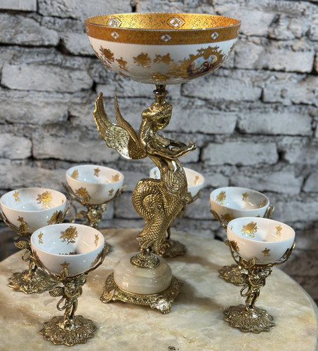 سرویس پذیرایی برنجی پایه سنگی ستون شاه ملائکه (یک ظرف و شش عدد پیاله) در دو رنگ