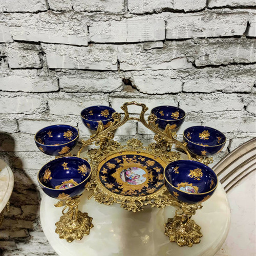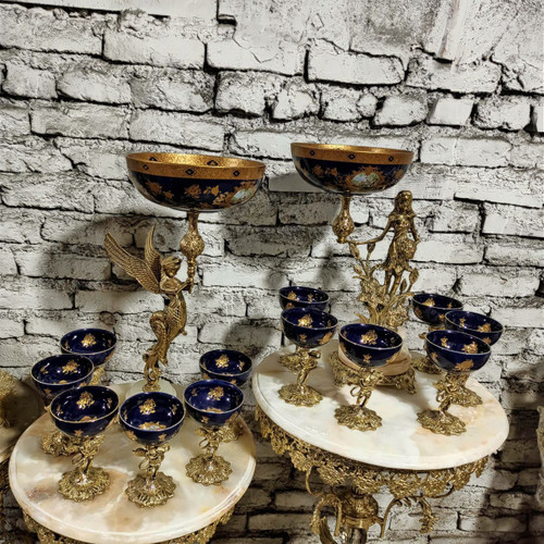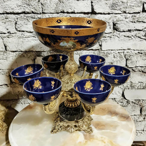 هفت سین پایه سنگی با کاسه و پیاله سرمه ای طلاکوب تمام برنج