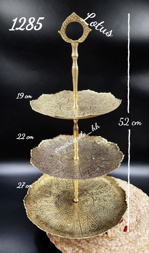 "شیرینیخوری سهطبقه برنجی لوتوس طرح هندی، مناسب دکوری و هدیه، طراحی لوکس و مقاوم، ایدهآل برای منزل و دکوراتور."