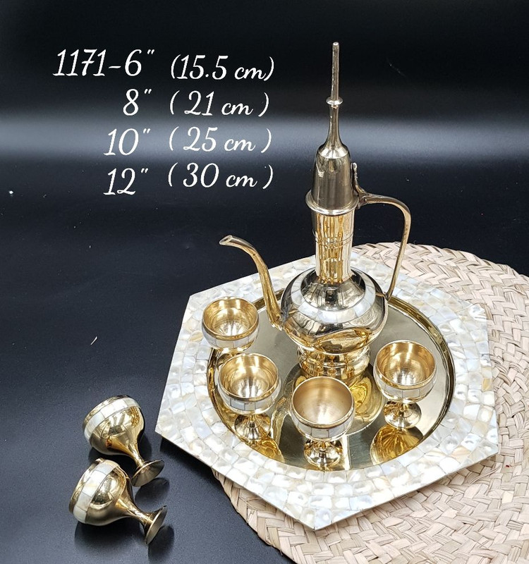 یک مجموعه دکوری زیبا و منحصربفرد از برنج هندی، شامل 6 جام، آفتابه و سینی با طراحی صدفکاری در چهار سایز مختلف، مناسب تزیین و دکوری منزل و فضاهای سنتی.