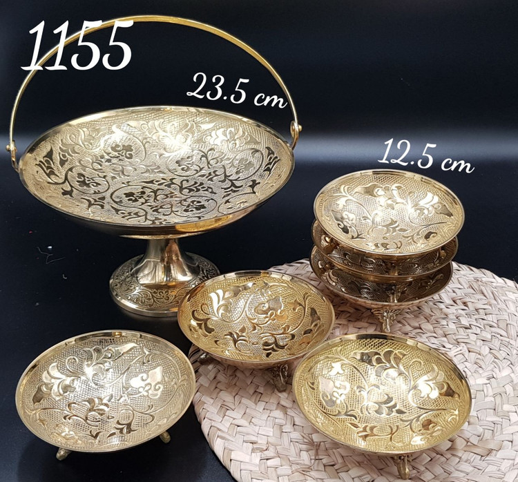 سرویس پذیرایی هفت تیکه برنجی هندیه شامل یک ظرف بزرگ دستهدار و شش ظرف کوچک، مناسب سرو و دکوری سنتی و لوکس.