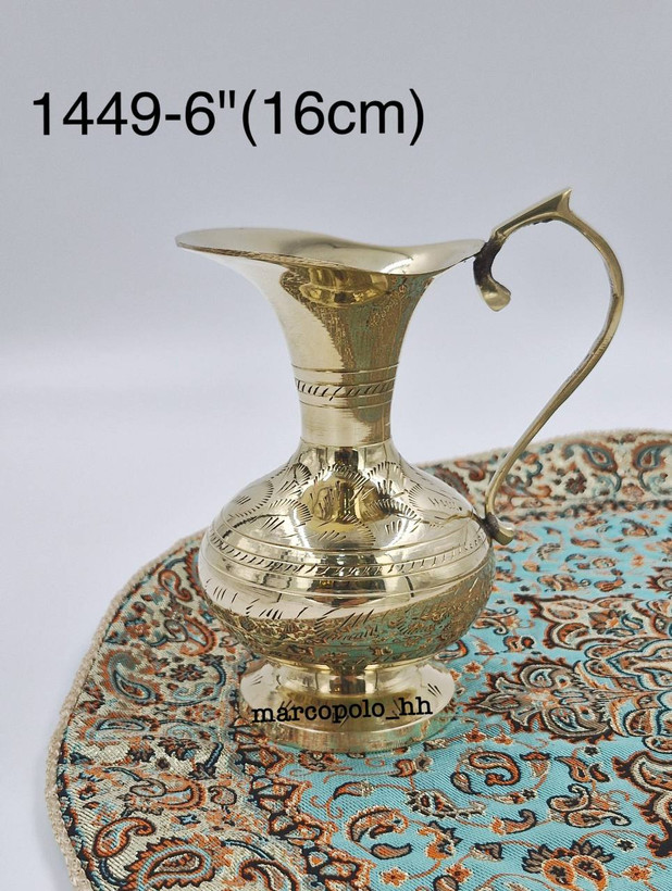 پارچ برنجی خمرهای با نقش قلم دست، ظاهری منحصر به فرد و کاربردی، مناسب برای سرو نوشیدنیها و تزیین میزهای خانگی و مهمانیها.