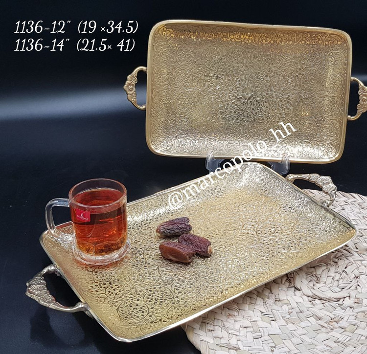 سینی برنزی مستطیل با طراحی گل، مقاوم و کاربردی، مناسب برای سرو غذا، تزئین میز، و استفاده چندمنظوره در فضای منزل و مهمانی، با ظاهر لوکس و اصیل