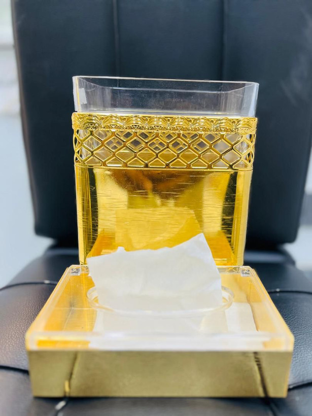 سطل و جا دستمالی با روکش طلایی، در دو سایز مختلف، طراحی لوکس و مقاوم، مناسب برای قرار دادن دستمال کاغذی در اطراف منزل یا دفتر، با ظاهر زیبا و شیک.