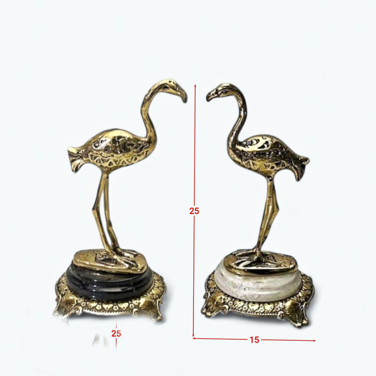 استند فلامینگو برنجی با پایه سنگ مرمر سفید، مشکی و سبز، یک اثر هنری چشمنواز برای دکوراسیون داخلی است. طراحی فلامینگو با جزئیات دقیق و جنس برنجی، جلوهای لوکس و مدرن دارد. پایه سنگی با رنگهای متنوع، تضاد زیبایی با رنگ طلایی فلامینگو ایجاد میکند. این محصول هم بهصورت تکی و هم جفتی قابل تهیه است و برای قرارگیری روی میز، کنسول یا شلف بسیار مناسب است. ترکیب فلز و سنگ، حس طبیعت و هنر را در کنار هم به نمایش میگذارد.