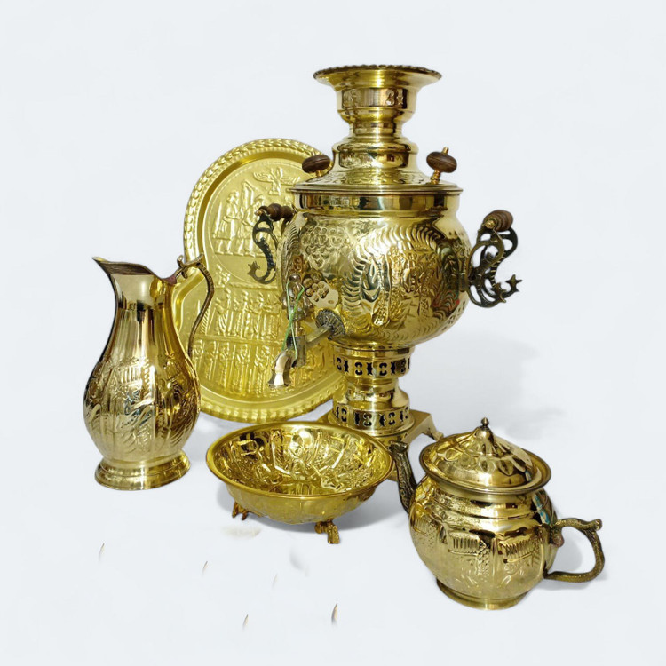 سرویس پنج پارچه سماور 6لیتری قلم برجسته شیر و خورشید مدل توپی