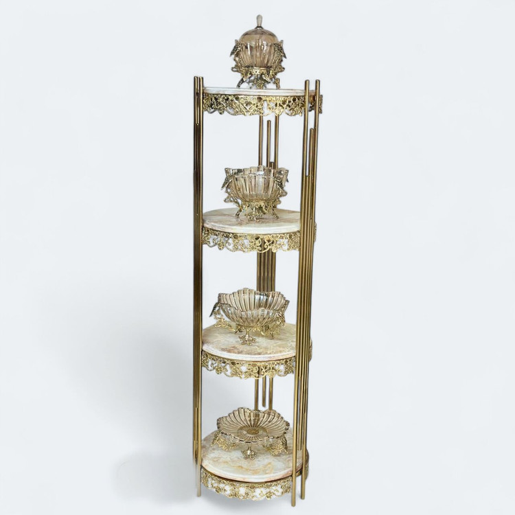 کنار سالنی چهار طبقه با ترکیب برنج و آهن، انتخابی بینظیر برای فضاهای داخلی با سبک کلاسیک یا مدرن است. طبقات از برنج با پرداخت براق ساخته شدهاند که جلوهای لوکس و درخشان دارند. فرم آهنی آن با طراحی مستحکم، پایداری و دوام بالایی را تضمین میکند. این محصول مناسب استفاده در سالن، راهرو، پذیرایی یا حتی اتاق خواب برای قرار دادن گلدان، مجسمه، کتاب یا وسایل تزئینی است. ترکیب فلزات در طراحی آن، حس صنعتی-لوکس خاصی به فضا میبخشد.