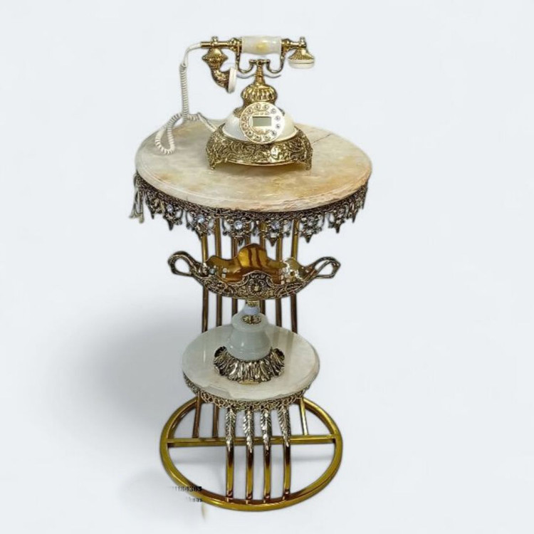 میز تلفن برنجی با سنگ مرمر مرغوب و طراحی گل آفتابگردان و پنجگل، ترکیبی بینظیر از هنر، طبیعت و کیفیت است. سطح میز از بهترین نوع سنگ مرمر ساخته شده که علاوه بر زیبایی، مقاومت بالا در برابر خط و خش و تغییر رنگ دارد. پایهها و بدنه از فلز برنج با آبکاری براق و قلمکاری گلدار تزئین شدهاند. نقش گلهای آفتابگردان و پنجگل، حس طراوت و انرژی مثبت را به فضا منتقل میکند. این میز مناسب دکوراسیونهای لوکس، کلاسیک و حتی مدرن است و میتواند نقطهی کانونی هر اتاق باشد.