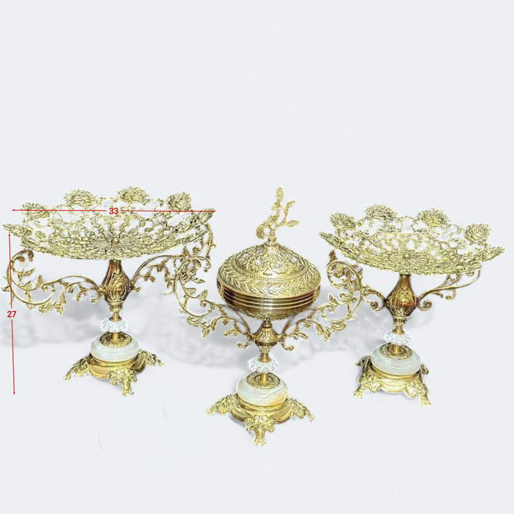 ست پذیرایی سهتکه رز، ترکیبی هنرمندانه از قلمکاری سیاه روی فلز برنج و سنگ مرمر طبیعی است. طراحی گل رز با جزئیات ظریف، جلوهای لوکس و رمانتیک به این ست بخشیده است. سنگ مرمر استفادهشده در رنگهای سفید، سبز و مشکی، حس طبیعی و اصیل را به محصول میدهد. این ست مناسب پذیرایی در مهمانیهای خاص، دکوراسیون کلاسیک و حتی هدیهای هنری برای مناسبتهای ویژه است. قلمکاری سیاه روی برنج، زیبایی آنتیک و ماندگاری بالا را تضمین میکند.