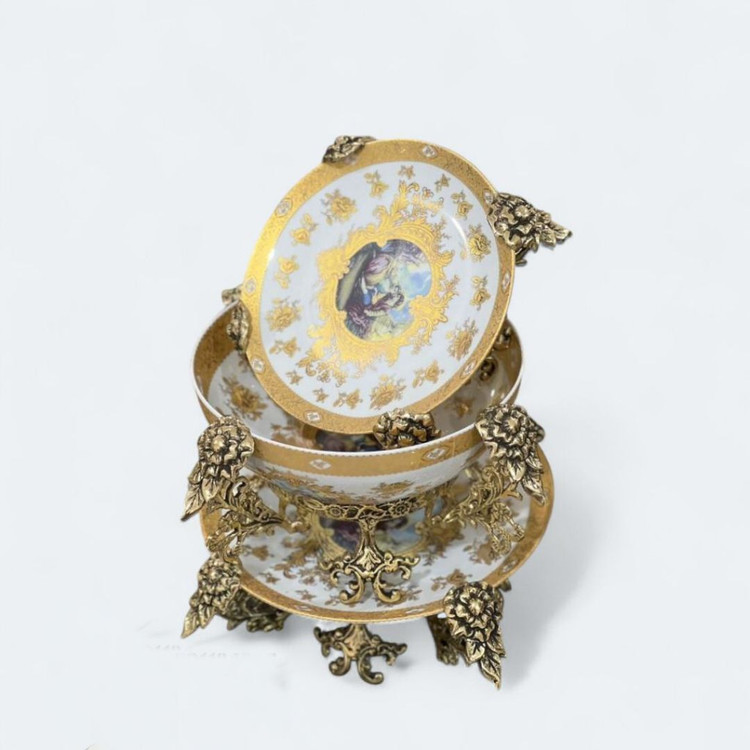 سرویس پذیرایی 3 تیکه پایه برنجی در رنگبندی سفید طلایی و سورمه ای طلایی