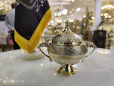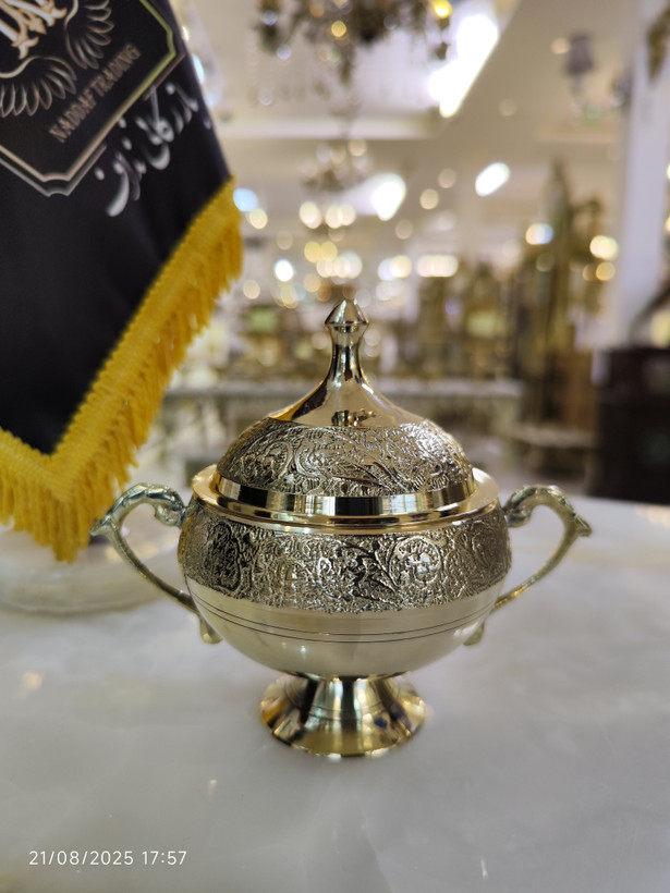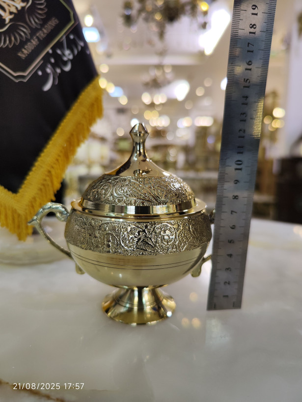 قندان دو دسته برنجی با طراحی طاووس و پایهدار، ترکیبی از هنر سنتی و کاربرد روزمره است. دستههای متقارن آن حمل و استفاده را آسانتر کرده و پایهدار بودنش جلوهای باشکوه به میز پذیرایی میبخشد. نقش طاووس با جزئیات دقیق روی بدنه حکاکی شده و جنس برنجی آن علاوه بر دوام بالا، درخشندگی خاصی دارد. این قندان مناسب پذیراییهای رسمی، دکوراسیون کلاسیک، و هدیهای منحصربهفرد برای علاقهمندان به ظروف سنتی است.