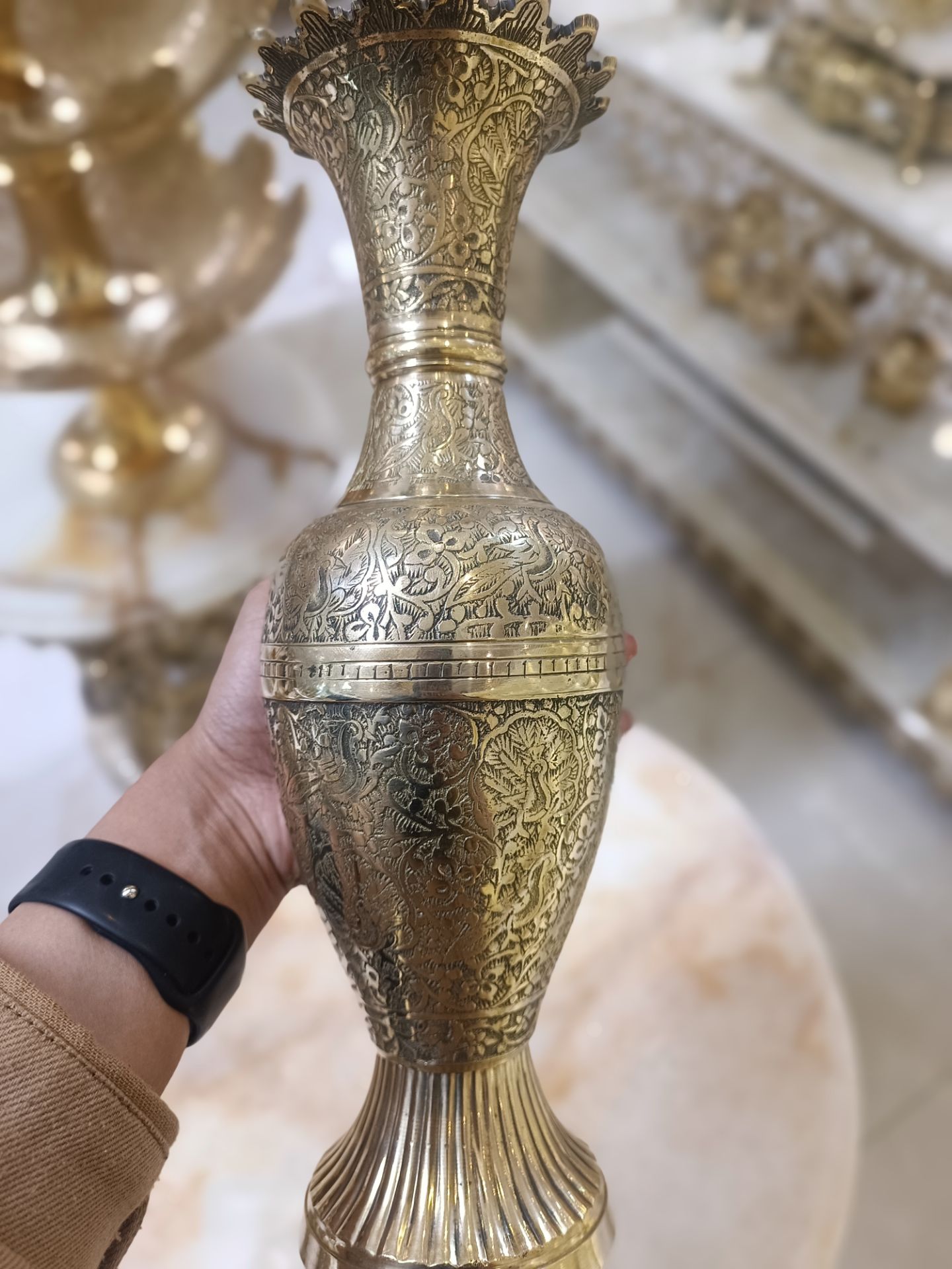 گلدان لب هلال طرح طاووس برنجی هندی