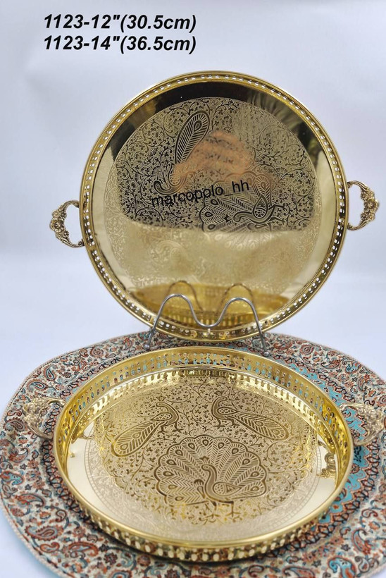 این سینی گرد برنجی هندی با طراحی طاووس، در دو سایز مختلف ارائه میشود. مناسب برای سرو پذیرایی، دکوری و تزئین میز است. ساخت دستساز و با کیفیت عالی، با هنر و ظرافت هندی که نقش زیبایی در دکور منزل و مهمانیها دارد.