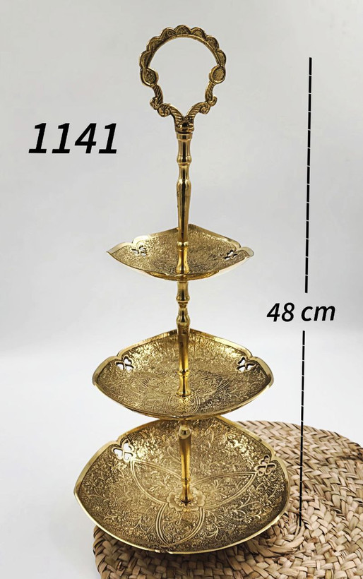 این شیرینیخوری سهطبقه با طرح گل برنزی هندی، ساخته شده از برنجی با طراحی سنتی و زیباست، مناسب سرو و تزئین شیرینیها در مهمانیها و دکوراسیون.