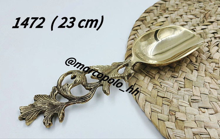یک قاشق برنزی با طراحی برگ انگور، مخصوص سرو آجیل و خشکبار، مقاوم و دکوری، ساخته شده از برنج اصل با طراحی منحصربفرد، ایدهآل برای میز مهمانی و دکوری منزل.