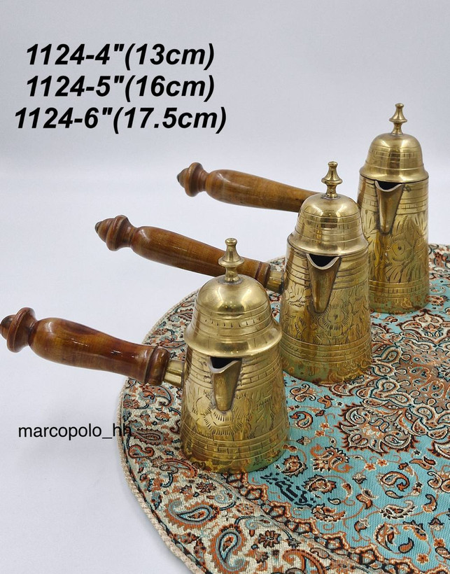 یک قهوهجوش برنزی، ساخته شده دستساز در هند، با درب و دسته قلمی، طراحی سنتی و مقاوم، مناسب برای دم کردن و سرو قهوه در منزل و محیطهای سنتی. جنس برنج اصل و زیبایی بینظیر.