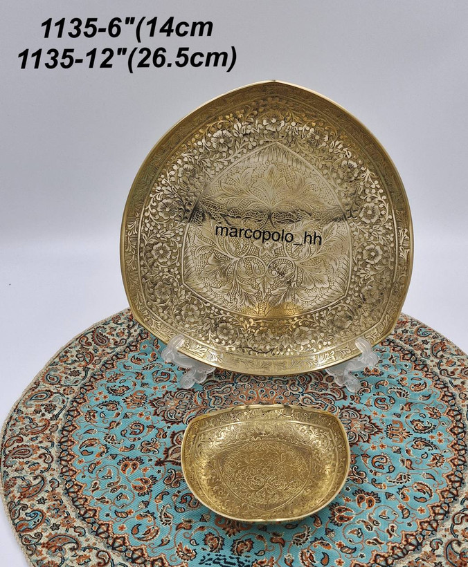 یک شیرینیخوری نیمپایه مثلثی برنجی هندی با طرح گل، در دو سایز مختلف، با ظاهری زیبا و مقاوم، مناسب برای سرو شیرینی و دکوراسیون میز مهمانی.